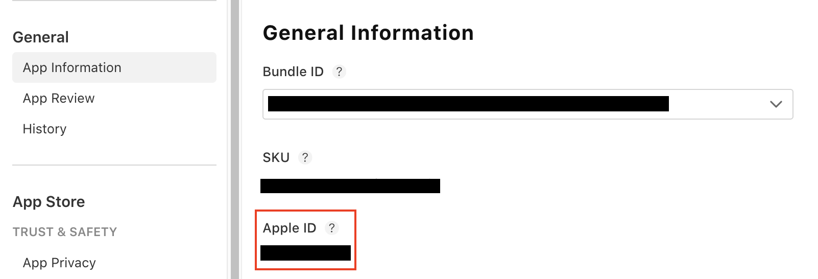 • Apple ID: You can find your Apple ID in App Store Connect under "App Information".