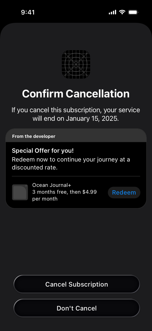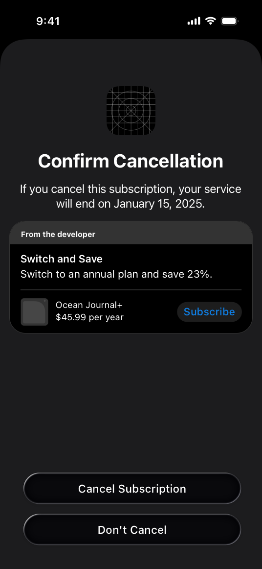 These messages are shown to users after they tap Cancel Subscription on the subscription details page. On the Confirm Cancellation screen, users can either complete the cancellation, tap Don’t Cancel, or, depending on the message, redeem an offer or switch to a suggested subscription.