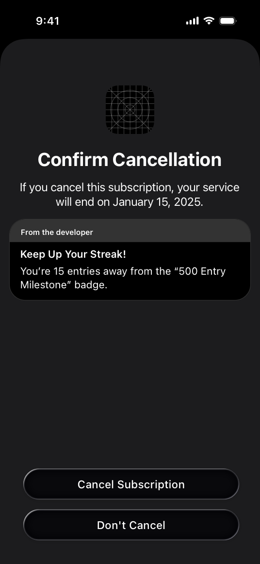 Apple’s Retention Messaging API allows you show messages to customers who are at risk of canceling their subscription. Retention messages help remind customers of the value of their subscription or present them with alternative options to continue their service.