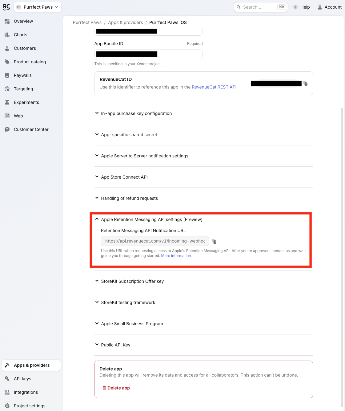 • Endpoint URL: You can find this URL in your RevenueCat dashboard on the App Store app’s settings page.