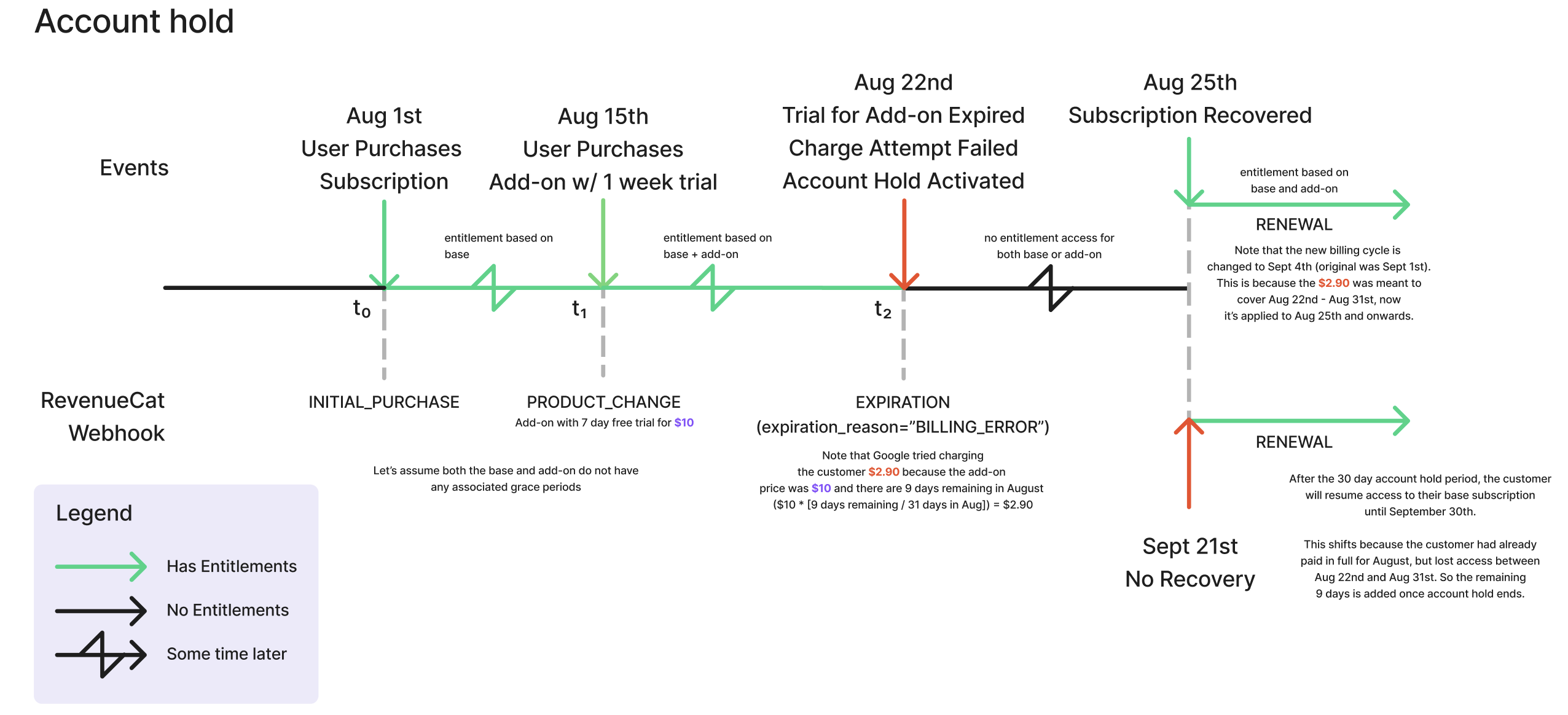 When the entire subscription purchase is in account hold, access to all subscription items is revoked until payment recovers, even if the customer had already paid in full for one of the subscriptions. When this occurs, there is some nuance regarding entitlement access while the entire subscription is in an account hold period. For additional information about account hold behavior for subscription with add-ons, please see Google’s example of account hold.