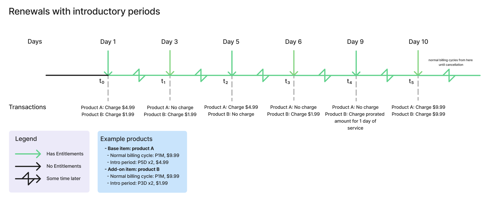 If the base subscription and add-ons have the same billing period but different introductory periods, they may renew independently until all introductory periods have ended.